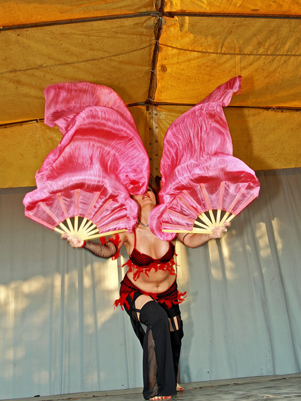 táncok olyan kellékekkel, mint a boa, legyező, kard vagy csörgődob.